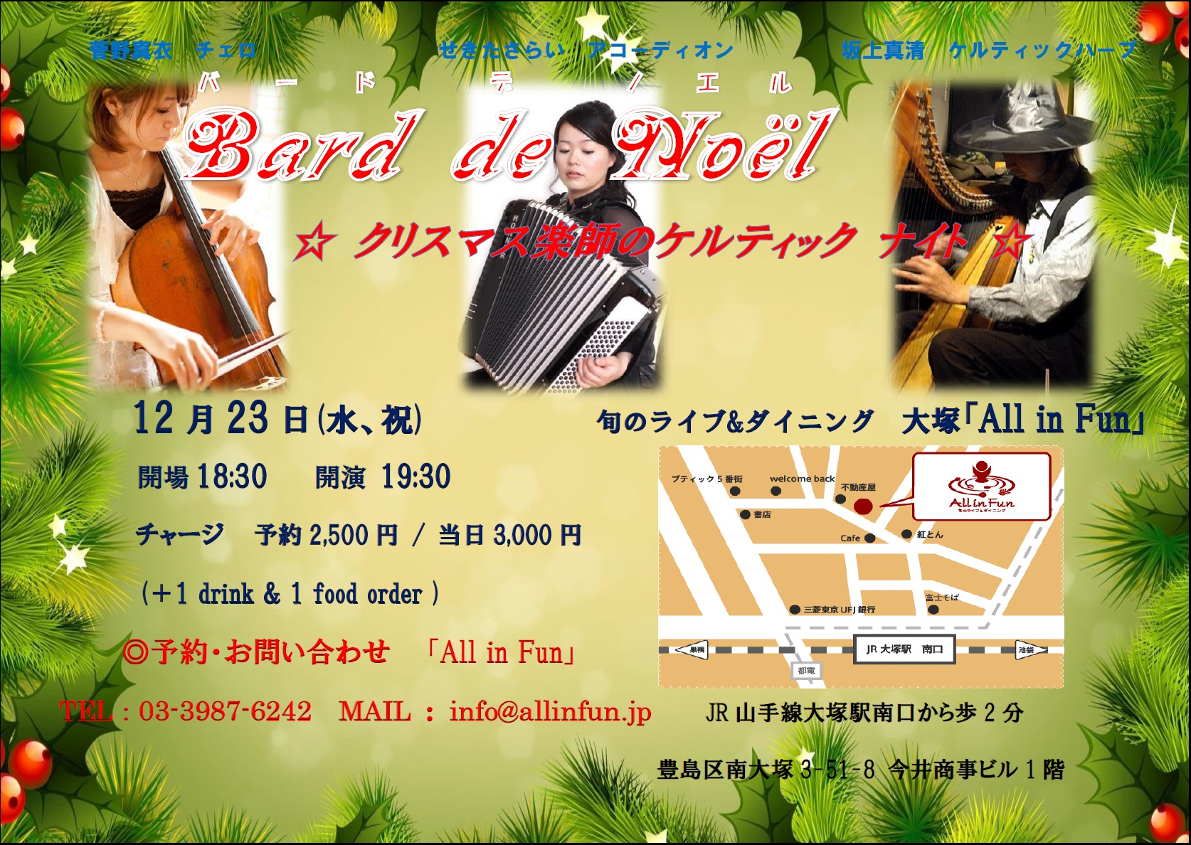 大塚All in Fun にて、「バード・デ・ノエル~クリスマス楽師のケルティックナイト」です。