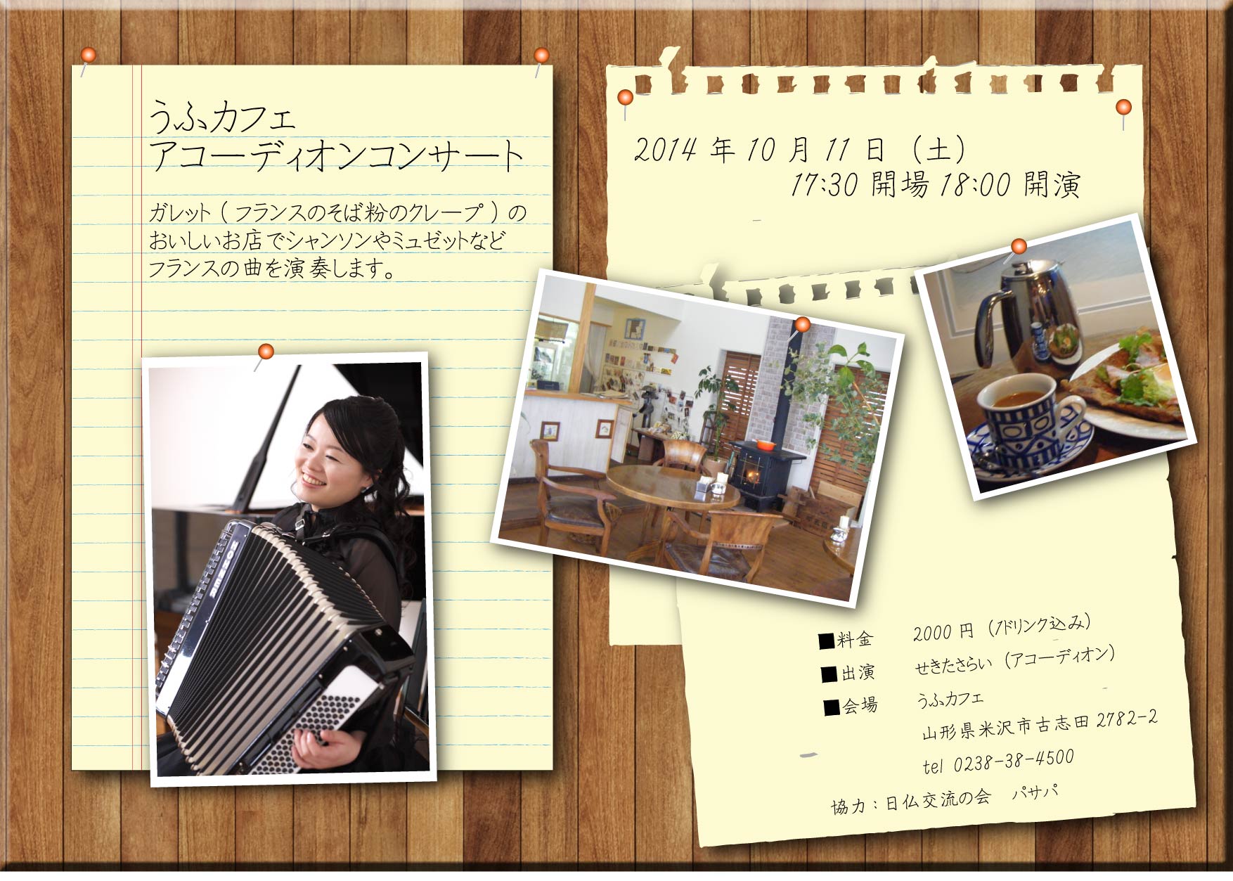 うふカフェに似合いそうな、シャンソンやミュゼットを演奏する予定です。