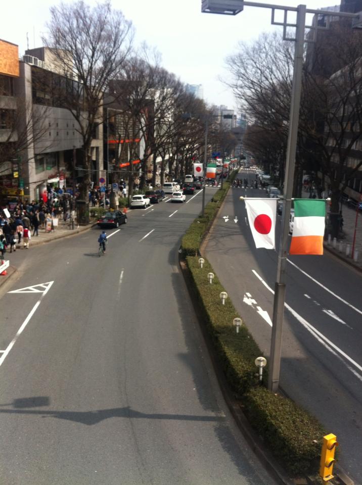 原宿駅前から、日本とアイルランドの国旗。