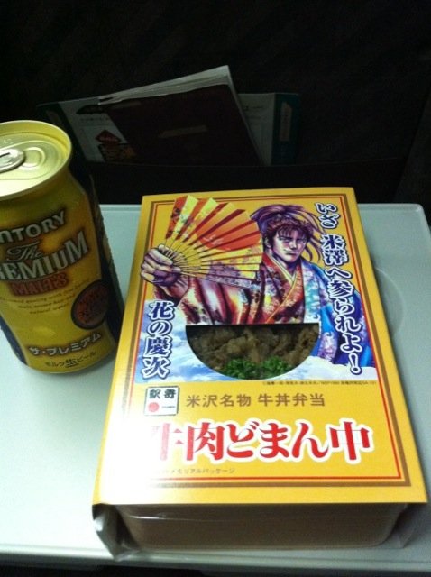 帰りの車内では、米沢名物「牛肉どまん中」弁当を。