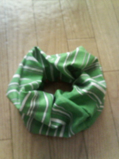 きゅうきょ、緑のハンカチでシュシュ作りました☆